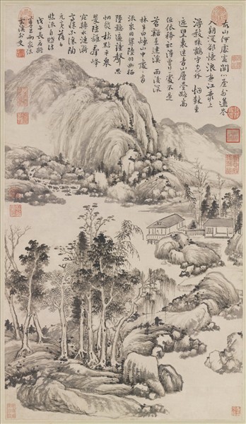 惲壽平(西元一六三三—一六九○年),江蘇武進人。自幼天資聰穎,八歲就能作詩,又擅長畫花卉和山水,被讚譽為清初六大家之一。 惲壽平晚期的作品,雖然多半以花卉寫生為主,但是這幅四十六歲所畫的山水,運用禿筆淡墨,描寫大江兩岸的景色,氣勢沉著穩重,不僅深得自然山川的神韻,搭配上長篇的題跋,尤其凸顯了畫家深厚的文學素養。