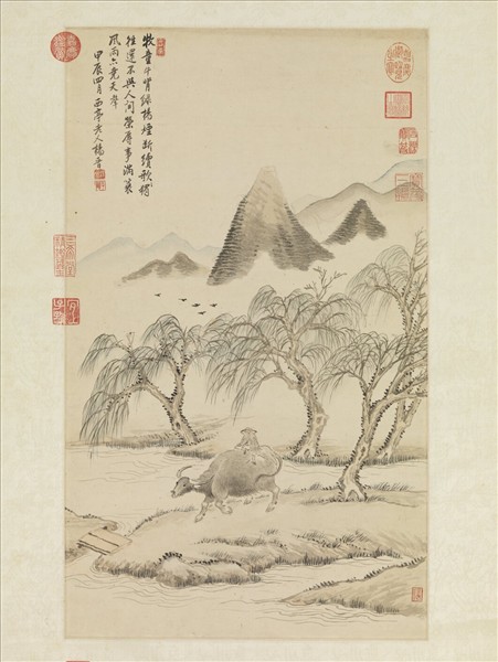 楊晉(1644-1728),江蘇常熟縣人。字子鶴,號西亭,晚年自號鶴道人。王翬的學生,山水畫很清秀,晚年作品比較草率。牛,畫得很好。王翬畫中的人物、車、轎、駝、馬、牛、羊等,聽說都是他代畫的。   楊晉畫郊野放牧一般的農村景物,在當時是很有名氣的。這張畫是他八十一歲時所完成,不像早年的工整。筆法,墨法,和渲染的方式,甚至款書的寫法,都很像他的老師王翬。