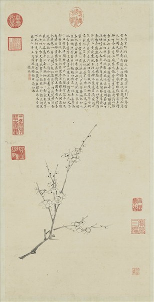 張照,字得天,號涇南,別號梧窗,晚年又號天瓶居士,江蘇華亭人。生在聖祖康熙三十(公元一六九一)年,中四十八年進士,官位累升到刑部尚書。死在高宗乾隆十(公元一七四五)年。為人廣識博學,精通詩文,音樂,佛經,尤其以書法出名,寫字餘暇,間作繪畫遣興。人物花卉都能,而且落筆不俗,特別是梅花,深為藝林推重,作品多是折枝小畫,不求工整精飾,隨意勾勒,疏花細蕊,自然有種瀟洒高雅的韻味。