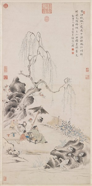華喦(西元一六八二-一七五六年),福建上杭人。字秋岳,號新羅山人。初寓杭州,後客居揚州鬻畫。兼善人物、山水、花鳥、草蟲,脫去時習,力追古法。 本幅畫榴花倚石,楊柳清池。鍾馗烏帽綠袍,據椅適坐,兀自品賞錦葵爭艷。身後案上,復設有果、酒、香粽等物。隨侍五鬼,一張破傘障日,一捧酒樽,一簪花於首。一則竊盤中廬橘而欲藏之腋下,另一鬼察覺,以左手攫去其巾,右手拳擊其頂。竊鬼縮頸吐舌,作驚怖之狀。通幅集故事性、趣味性於一紙,令觀者忍俊不禁。