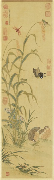 陳書(西元一六六○—一七三六)是秀水的女畫家,因為兒子錢陳群享有功名,而被朝廷封為太淑人。山水、人物、花鳥、草蟲,都極擅長。本幅的格局,雖然屬於草蟲生態的集錦,但是無論落筆或者傅彩,均能在疏秀間,蘊含有老辣的氣息,毫不失卻藝術創作的表現本質。蜻蜓、螳螂、蝗蟲、鳳蝶,蚱蜢與鵪鶉的描寫,更是栩栩生動,令人玩味不盡。