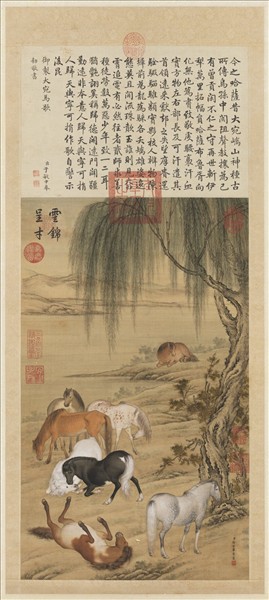郎世寧(西元一六八八-一七六六年),意大利人。十九歲時,入天主教耶穌會為修士。曾習油畫,兼習建築。二十七歲來華傳教,以繪事供奉內廷。歷仕康熙、雍正、乾隆三朝。畫法參酌中西,善畫人物、花鳥,尤擅犬馬。  八駿中,滾塵、舔足、伏地者,與郎氏「百駿圖」卷中三馬之動作相同,似出自同一寫生稿本。本幅雖仍具西洋風味,但與中國繪法融合之程度,較之「八駿圖」為深,馬蹄立處不畫影,背景樹石山水不刻意追求光影之變化。詩塘有乾隆己卯年(一七五九)御詩,時郎氏七十一歲。