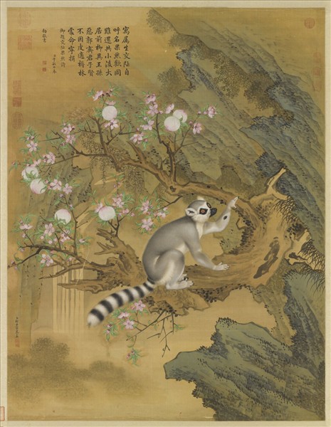 郎世寧(西元一六八八-一七六六年),意大利人。十九歲時,入天主教耶穌會為修士。曾習油畫,兼習建築。二十七歲來華傳教,以繪事供奉內廷。歷仕康熙、雍正、乾隆三朝。畫法參酌中西,善畫人物、花鳥,尤擅犬馬。  畫桃樹一株,自山崖邊斜伸而出,花葉盈枝,果實纍纍。果然攀枝欲上,似有所顧,神態疑惑,觀物深至,傳神絕妙。交阯為清之藩屬國安南,乾隆二十六年(一七六一)安南王新立,是年累有進珍禽異獸,乾隆曾寫御製詩題詠此事,與畫中詩同。時郎世寧七十三歲。