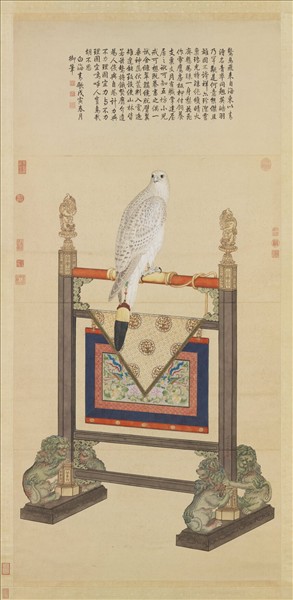郎世寧(西元一六八八-一七六六年),義大利人。十九歲,入天主教耶穌會為修士,習畫兼習建築。二十七歲來華傳教,召入內廷供奉,善畫人物花鳥,尤善畫馬。白海青為獵鷹中之名種,其猛鷙之性,虎虎若生,韝簾等物,亦描摹神似,為畫中寫實之佳作。