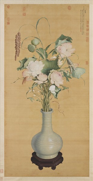 郎世寧(西元一六八八至一七六六)。意大利人,十九歲,入天主教耶穌會為修士,習畫兼習建築。廿七歲來華傳教,召入內廷供奉,善人物花鳥,尤善畫馬。畫瓶中並蒂蓮和小米,以記祥瑞。下筆穩重,著色典雅。圖作於雍正元年,時年三十五,為院藏郎氏來華最早作品,故西畫氣息,甚為濃重