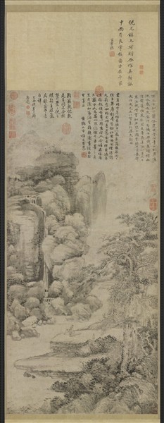 倪瓚(西元一三0一─一三七四年),字元鎮,號雲林,江蘇無錫人。王蒙(一三0八─一三八五),字叔明,號香林居士、黃鶴山樵,浙江吳興人。均為元四大家之一。 據畫上王蒙題跋得知,王蒙曾為倪瓚作「松石望山圖」,倪瓚照原畫仿作一幅贈送友人文伯,便是本幅。後王蒙在橘廣文處見此作品,並在畫上點綴增補,於是成了此幅合作山水。