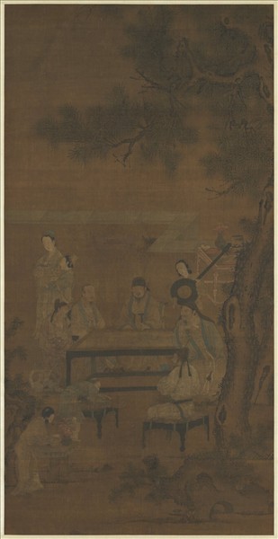 大松下五位士人圍長案雅聚,童子張琴,仕女抱阮或備茶,人物器用俱以中鋒細筆鉤勒,頓起頓收,轉折挺勁,如畫樹的枝椏。畫上無作者款印,舊傳周昉作。按周昉(活動於八世紀末)是陜西長安人,唐代著名人物畫家,畫史稱其人物善於刻畫個別的性格,並能掌握特定環境下的情態。本幅構圖似是取自其他作品拼湊而成,如士人圍坐的構圖便是摹仿傳世十八學士的一段。