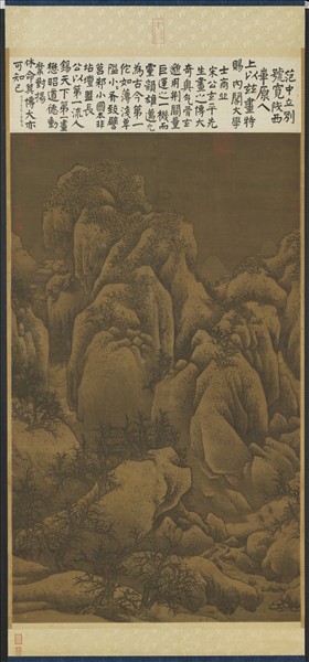 林巒積雪,萬木俱凋,寒氣逼人。小徑蜿蜒,幽谷深邃處寺宇森列。幅中枯樹偃仰稀疏,樹幹矗立,堅硬如鐵,枝枒四出,挺如劍戟,畫法至為蒼古。雖然詩塘王鐸的題跋稱此畫出自范寬之手,然本幅無款印,筆墨亦與范氏不類,應為後人所為。  范寬(十-十一世紀),陝西華原人。本名中正,字仲立。性寬厚有大度,時人稱為范寬。山水師李成、荊浩,但自立新法,為北宋初年的山水畫大家。