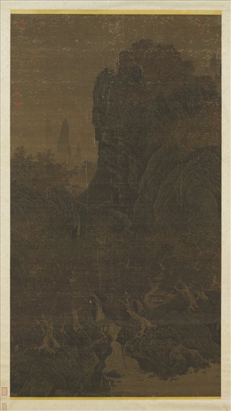 范寬(11世紀初),華原(今陜西華原)人。本名中正,字仲立。因性情寬厚,時人稱為范寬。畫山水,先學李成,再學荊浩,用筆強勁有力,用墨厚重。構圖取景單純,所以在視覺上,特別能表現出山形的雄偉壯觀,以及質量感,這幅的山石皴纹係用斧劈,與本院收藏另一幅使用雨點皴法的「谿山行旅圖」比較,面目顯見不同,而與李唐畫風較為接近。畫中紅楓飄於水上,詩意是唐崔信明句「楓落吳江冷」。