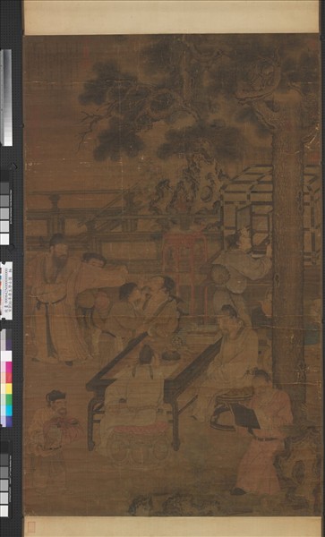 劉松年(活動於西元1174─1224年),浙江錢塘人。居清波門,俗呼劉清波,又呼暗門劉。為南宋孝宗淳熙年畫院學生,紹熙年待詔。工畫人物、山水。師法張敦禮,神氣精妙,名過於師。 此畫唐學士陸元朗、孔穎達、李玄道、房玄齡、蘇勖燕居文會情景。按五人皆為秦府十八學士中人,與院藏劉松年唐十八學士卷第三段人物布景均同,而筆墨之精練略不如原圖,或有四幅,今僅存一。