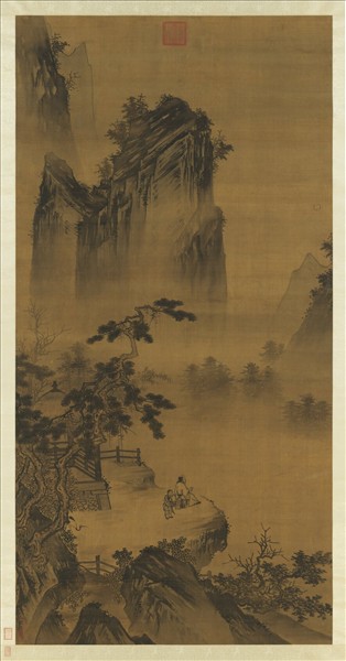 本幅縱筆粗豪,高峰聳起如屏。林間亭台,一人舉杯邀月,一童子捧瓶侍候。畫原籤題為馬遠(活動於西元1190-1224年),但幅下右角有墨書「欽禮」二字,研究者以為當係明代浙派後期名家鍾欽禮(約西元十五、十六世紀)之款。按,鍾禮,字欽禮,號南越山人,浙江上虞人。據稱成化(西元1465-1487年)間召入仁智殿,大受賞譽。擅畫雲山,並工草蟲。