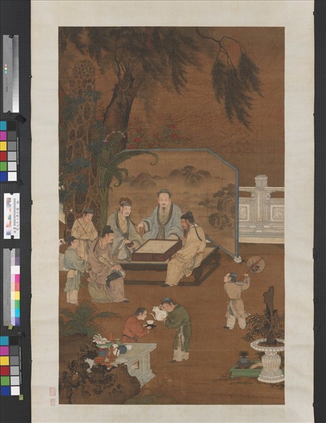 唐太宗命閻立本為文學館十八學士作畫,自此十八學士之題久為中國畫家所好。此圖宋人之作,畫學士二人對奕,二人旁觀,全神貫注,極為專一。 本幅構圖精妙,學士背後屏風與隨侍僕役形成一環,烘托主題,使四學士愈加突出。園中有柳、石榴花、巨石、芭蕉等。且有一奇石盆景,由此觀之,國人欣賞奇石之癖好,由來久矣。