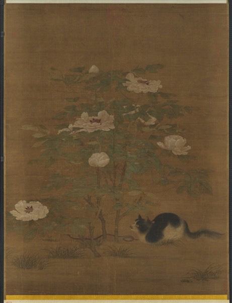 牡丹花下,搏一貍奴。兩眼灼灼如有所窺。花葉皆用雙鈎,筆意沈著。用粉用綠,靜穆厚實。貓用焦墨淺粉,墨色極重,故甚突出。而毛衣著筆,亦遒勁有力