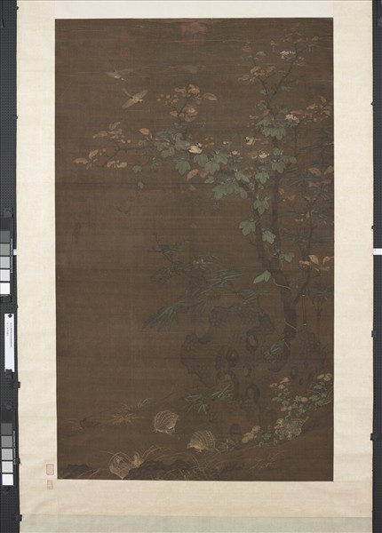 畫竹石秋卉,牽牛纏枝,小鳥飛鳴林際,鵪鶉棲息石旁。大抵宋人花鳥畫,法度嚴謹,形似逼肖。此幀筆墨古樸,敷色厚重,工整細繪中,亦得見生趣。