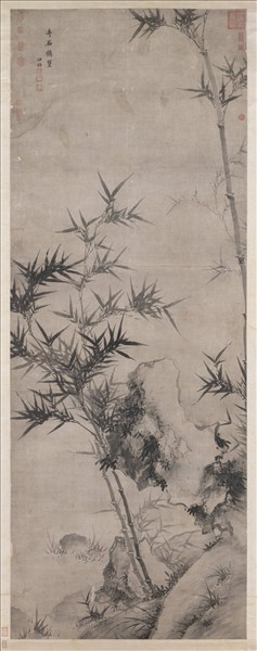 夏昶(西元一三八八-一四七○年),江蘇崑山人。字仲昭,號自在居士,又號玉峰。擅長畫墨竹,畫法學自王紱(一三六二-一四一六)、陳繼(一三七○-一四三四)。   本幅畫水濱竹三竿,婷立於斜坡之上。竹桿落筆穩健,墨色潤厚。竹葉、小草挺勁鋒利,畫石則筆法扭轉靈動。夏氏妙於運筆使墨,極得飄灑清妍之趣,此作堪為例證。