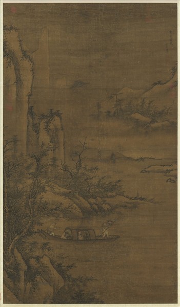 周文靖(西元十五世紀),福建閩縣(莆田)人。山水學夏圭、吳鎮,蒼潤精密,筆力古健,醞釀墨色,各臻其妙。宣德間以陰陽訓術徵入仁智殿,御試「枯木寒鴉」第一,授命為大庾縣典史,歷官掌禮儀的鴻臚寺序班。  此圖描寫東晉名士王徽之夜裡夢醒,見月色皎潔興致突生,遂趨船造訪好友戴逵。然抵達之後,又打消念頭而折回,或曰:「乘興而來,盡興而返。」為明代歷史人物故事畫之佳例。此幅構圖繼承南宋馬、夏特色,卻較之概括簡約,而其瀟灑放逸之筆法,則近似元人風格。