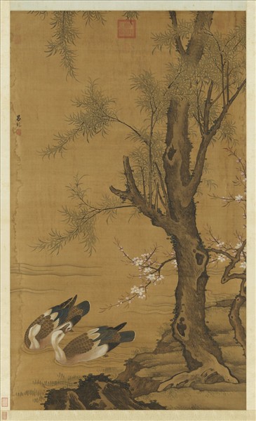 呂紀(活動於西元1439-1505年間),浙江鄞縣人。字廷振,號樂愚,一作樂漁。花鳥初學邊文進,後摹唐宋諸名家筆,始臻其妙。弘治(1488-1505)間被徵值仁智殿,為錦衣衛指揮使。   本幅為一工整之作品,惟用筆稍覺欠力。畫柳樹迎風,桃花秀麗。當此春暖花開時節,雙鳧優遊水中,怡然自得。