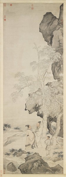 仇英(約一四九四-一五五二),居蘇州。曾為漆工,後以畫藝聞名。從周臣學畫,擅長山水、仕女、人物。又長於臨摹古人作品,幾可亂真。為明四大家之一。 幅中畫溪流之間,梧桐樹下,兩人執手相談,表達文人生活雅趣。畫山石筆勢瀟灑縱逸,墨調對比較強。畫人物也是筆法快速,挺拔勁健,但不失溫雅。本幅與院藏「蕉陰結夏」可能原為同套四屏之一,是應項元汴所請而作,為裝飾廳堂之用。