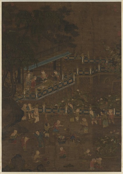 端午日,樹陰敞榭,曲橋池沼中荷花綻放。群嬰歡戲。扮戲、舞旗、摘荷、擊鈸、捉蜻蜓等等,其樂融融。人物描繪生動,地面上羅列各色玩具刻劃入微。主要內容俱以金線勾描,顯富麗裝飾性。蘇漢臣(約西元十二世紀),河南開封人。曾任宣和畫院待詔,北宋亡於金後,南宋紹興年間又進畫院復職。師劉宗古,工畫道釋、人物臻妙,尤善嬰孩。