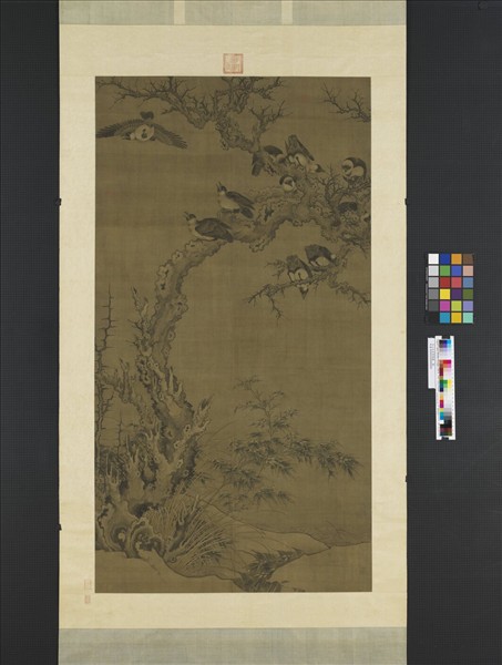 這幅畫霜雪後,群鴉聚在枯木上跳躍鼓噪,各有不同的姿態。畫鴉弧形特別多,漬染陰陽分明,顯得渾圓可愛。樹幹的用筆,像是不停地折轉運行,形成許多剝裂的老皮和癭瘤,顯得非常蒼勁古老。坡土、竹葉還覆蓋著白雪,古樹在殘雪輝映中,不禁有嚴寒蕭條之感,但鳴噪的群鴉,卻給畫面帶來了活潑的生意。