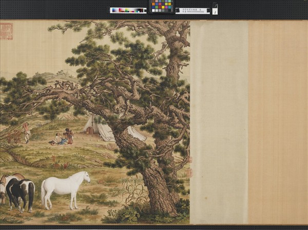 郎世寧(西元一六八八-一七六六年)是意大利來華傳教的耶穌會教士,他以精湛的繪畫技藝而供奉朝廷,歷仕康熙、雍正、乾隆三朝。善繪人物、花鳥、禽獸。 本幅畫姿勢各異的駿馬百匹,遊憩於草原之間,樹石、山水、人物無不寫實精緻。全幅色彩濃麗,構圖繁複,形象逼肖;又以中國傳統畫技法加入西洋光影透視法及西畫顏料,使畫面顯得中西趣味兼容併蓄,為郎氏早期典型代表作品之一。