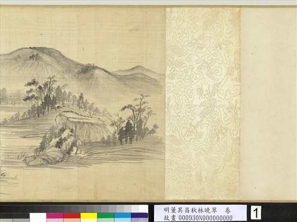董其昌(西元一五五五-一六三六年),字玄宰,號香光、思翁,松江華亭人。萬曆十七年進士,天啟年間官至南京禮部尚書,後請歸故里,隱居以書畫自娛。近景坡石間喬松、枯木及雜樹林立,多以濃淡墨橫點,樹後露出幾間屋宇。高峻山巒互疊,草木蒼翠,對岸遠山起伏連綿,遙接天際。山石繪法採披麻皴,並以水墨暈染,雖仿自黃公望、趙孟頫,仍具有率筆寫意的董氏特色。