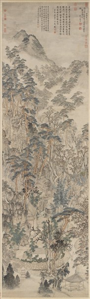 張宏(1577-1668後),吳郡(江蘇蘇州)人。他擅長畫山水,用短促的筆法和濕潤的墨色畫山石樹木,獨具特色,構圖也常有新意。 他常以實景山水入畫,本幅即是一例。棲霞山在南京近郊,以寺院和千佛洞聞名。題跋標明作於一六三四年,是與友人冒雨登山眺望所見。畫中雲霧氤氳,林木繁茂,掩映著小徑、寺院、與密集的小佛龕,在龐大畫面上營構出生意盎然的世界。