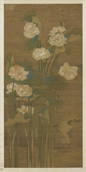 許儀(西元一五九九-一六六九年),江蘇無錫人。字子韶,號歇公,又號顧影子。李采石之甥,畫得其傳,有出藍之譽。山水人物界畫及花鳥蟲魚,無一不精。   畫叢荷卓然挺立於水中,花形碩美,碧葉豐鮮,採勾勒填彩法成之。花筋葉脈皆勾畫細謹,白粉、石青的局部敷染,重而不滯,呈現芙蕖妍麗嬌美之姿。本幅右下角有二方作者許儀的鈐印。