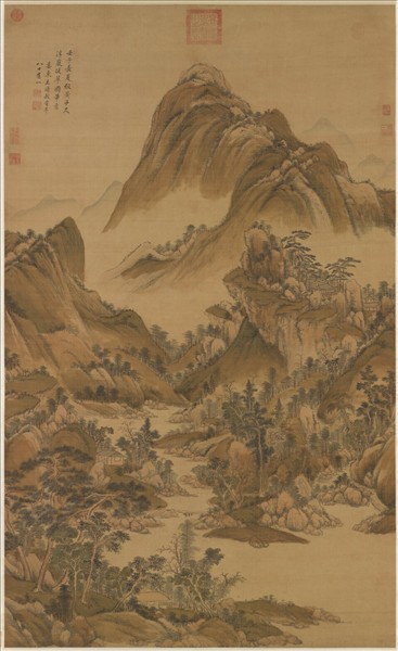 王時敏(西元一五九二-一六八0年),江蘇太倉人。字遜之,號煙客,自稱西廬老人、西田主人、偶諧道人、歸村老農。詩文書畫俱佳,而於山水特有體會,為清四大家之一。 本幅畫嵐峰煙樹,蒼翠欲滴。王氏作畫多以黃子久為依歸,此幀谿壑布局皆近子久,而巽筆濕墨,自具別裁。色用大綠,和膠稍濃,故多變為焦黃,損色不少。據畫右作者款題,此為王氏八十一歲的作品。