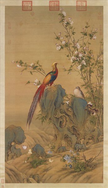 郎世寧(西元一六八八-一七六六年),意大利人。十九歲時,入天主教耶穌會為修士。曾習油畫,兼習建築。二十七歲來華傳教,以繪事供奉內廷。歷仕康熙、雍正、乾隆三朝。畫法參酌中西,善畫人物、花鳥,尤擅犬馬。  圖繪山澗溪流,二錦雞棲立湖石上,石旁雜卉、綠竹、靈芝叢生,寓「春光似錦」之吉語。