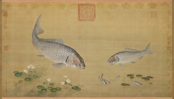 郎世寧(一六八八-一七六六)意大利人。十九歲入天主教耶穌會為修士,習畫與建築。廿七歲來華傳教,召入內廷供奉。善畫人物花鳥,尤善畫馬。  本幅畫池中游魚。取材構圖純為中國式,但設色用筆卻以西洋畫法為之,光影的描寫在兩條大鯉魚的頭部尤為明顯,用白粉以表現受光處,也很成功。