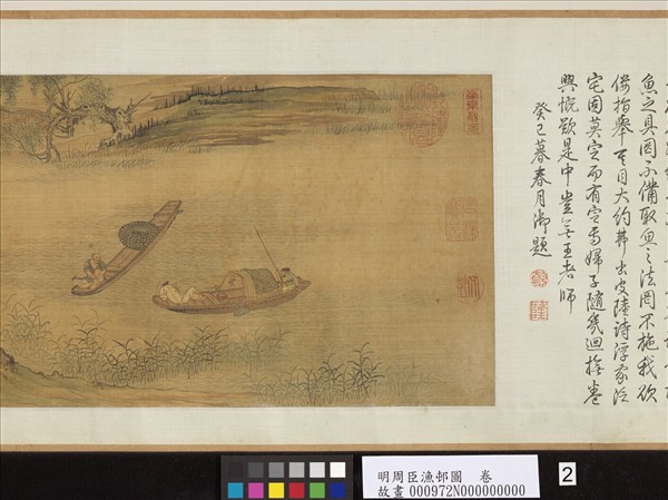 周臣(約西元一四五○至一五三五年),江蘇蘇州人,字舜卿,號東邨,善畫山水人物。山水師法宋人,得力於劉松年、李唐、馬遠、夏珪最多。用筆純熟慎密,風骨峭勁雅健,嘗傳授畫法於唐寅、仇英。   本幅描繪江上捕魚人家的日常生活情景,極為細膩生動:有泛舟江上無所事者,有泊舟江邊打盹者,有舟船三兩相聚,船家相互飲酒作樂者,亦有漁夫與鵜鶘正在合力捕魚者。西行過了拱橋,田舍在望,此時漁家在岸邊用膳休息,漁獲也在此交易。通幅用筆謹細,設色雅淡,人物布景皆安排的條理有序。