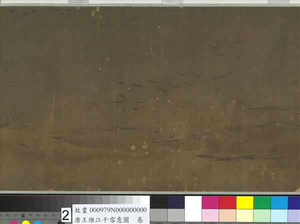 王維(西元七○一—七六一年,一作六九九—七五九年),山西祁縣人,字摩詰。王維是唐朝著名的詩人,也是書畫名家,他的山水畫著重意境與詩意的表現。董其昌提倡南北分宗時,將王維稱譽為南宗之祖。本幅畫冬天江邊村舍情景,雪覆蓋大地,木葉早已凋盡,鴻雁飛過天空,為寂靜的大地增添了生意。此卷是否出於王維之作,仍有很大的疑問,而畫法溫婉優雅,比較接近於北宋趙令穰畫風。