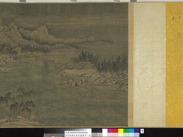 巨然(活動於西元十世紀後期),南唐鍾陵(南京)人,開元寺和尚,南唐亡(西元九七五年),巨然隨李後主降宋,遷至汴梁(開封)。擅山水,畫法師承自董源。濤濤江水流貫層巒密樹,山石陰陽之皴染特見工夫,其陽多留白,頗有殘雪之寒意。畫無名款,山石皴紋、樹木畫法有巨然遺風。