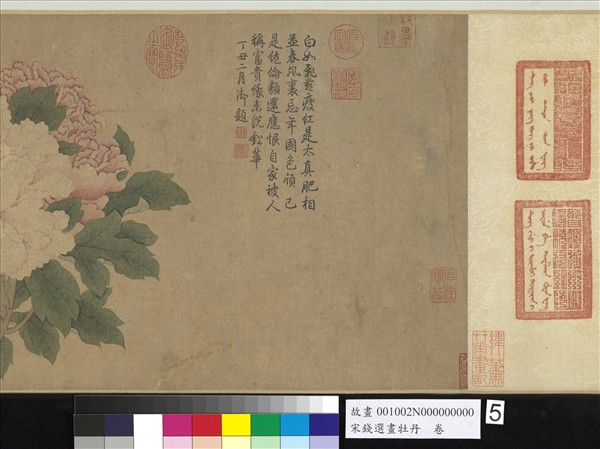 錢選(西元1239─1301年),浙江吳興人。字舜舉,號玉潭,又號清□老人、習嬾翁。宋景定間鄉貢進士。元初吳興有八俊之號,趙孟頫稱首,選亦與焉。其畫人物、花鳥、山水均高超絕俗。 本幅畫紅白牡丹二枝,枝莖、葉脈、筋絡均以細筆鉤勒,用筆精謹,賦色淡雅,清新脫俗。卷末尚自題七言詩一首。款署:「霅豁翁錢選舜舉」。