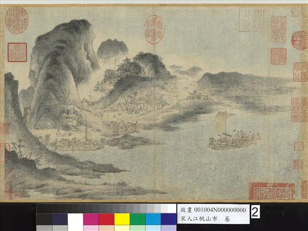 江上帆船一艘,船頭有繅車,後艙篷頂,籠畜雄雞一,蓋用以報曉取時。江波粼粼,用筆細挺。岸旁已停泊三舟,皆有籠雞之蓄。岸上有驅驢者,道逢相拜者,騎驢投店者。山道間,遠處迷濛,有駝隊成群。山谷中嵐煙凝白,飛鳥結陣,一片黃昏景色。兩山回抱而起,山峰結構及樹法、水波畫法,與燕文貴畫風極接近。