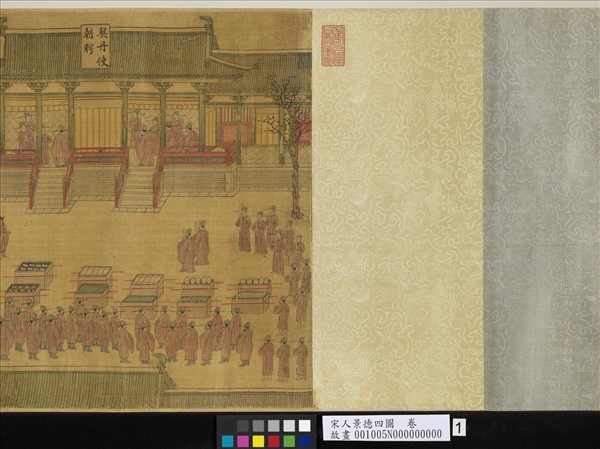 此圖乃記錄宋真宗景德元年(1004)契丹遣使韓杞奉書行宮請息兵納和,與曹利用偕來初議求關南地的史實,整卷幅上各以楷書標題,幅後附文記史。「契丹使朝聘」所繪建築由台基、柱身、斗栱、屋頂垂直疊加而成,主殿為歇山頂,左右兩側有耳殿相連,屋頂正脊兩端有鴟吻裝飾,鴟性好水,置於屋上以禁火災。垂脊與岔脊端則以獸頭終結。 屋檐兩角起翹,檐下一周在柱頭上使用「一斗三升」式斗栱,結構單純,頗顯疏朗,用材數較大。此殿身闊五間, 為加強當心間(正中一間)的重要性,增大其柱距,次梢間遞減。於次間殿前設踏道,採「兩階制」設東西階的做法,《禮記. 曲禮》說:「主人就東階,客就西階。」顯示出中國古代建築設計亦深受禮的制約。畫中亦可見散水磚設於台基下四周,以承受屋檐上滴下之水。