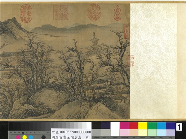 此卷為唐寅(1470-1523)為鄭儲豸送行而作,鄭當時任蘇州地方官。起手一片霜林,林影深處,城樓隱約其中,蓋即蘇州城之閶門。城外木橋高拱,行人往來其上。送別者一行,散列於船埠,最前一人回首作揖,即鄭儲豸。全幅大體皆用中鋒,行筆雖草草而實為悉力之作。畫山皴筆及款書筆意,與「函關雪霽」圖極近似,兩畫均約作於西元1507年。