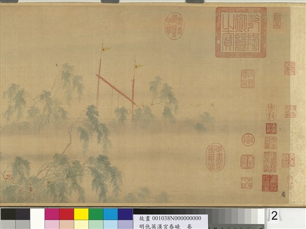 1.本幅以春日晨曦中的漢代宮廷為題,描繪後宮佳麗百態;其中,並包含畫師毛延壽為王昭君寫像的著名故實。 通幅構景繁複,用筆清勁而賦色妍雅,林木奇石與華麗的宮闕穿插掩映,舖陳出宛如仙境般的瑰麗景象。除卻美女群像之外,復融入琴棋書畫、鑑古、蒔花等文人的休閒活動,誠為仇英歷史故事畫中的精彩力作。此畫係為項元汴所作,完成時間約在嘉靖廿一年(一五四二)以後。