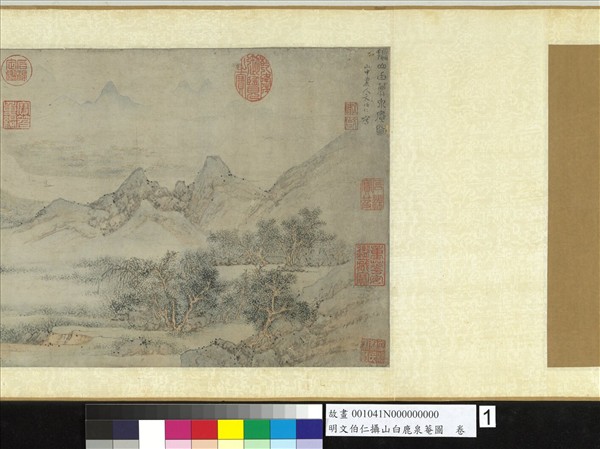 文伯仁(西元一五○二-一五七五年),字德承,號五峰,長洲(今江蘇蘇州)人。文徵明的侄子。長於人物、山水畫,承襲沈周、文徵明,並師法王蒙。   攝山在江蘇江寧縣東北,一名棲霞山。約嘉靖三十四年(一五五五)文伯仁寓居此地白鹿泉庵,並與南京友人結茶社。此圖描繪由平地入山,經途所見,起首遠眺長江,中段棲霞寺隱於山麓,最後為白鹿泉庵,在重山峻嶺中,倍覺清幽。