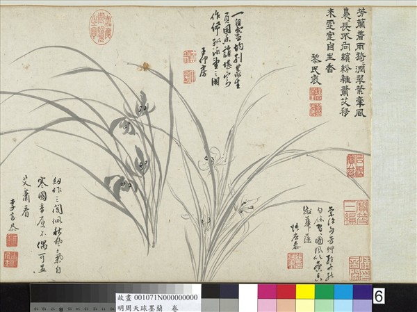 周天球(西元一五一四-一五九五年),字公瑕,號幼海(明畫錄作幻海),長洲(今江蘇蘇州)人。諸生,少遊文徵明門下,習書法,徵明亟許可之,善大小篆、古隸、行、楷,晚能自得蹊徑。善寫蘭草,得鄭思肖法。自趙孟頫後寫蘭已少見,復於公瑕見之。甚為可喜。   本幅畫墨蘭十餘棵,或偃或仰、或濃或淡、極盡變化之能事,繁花幼蕊,幽香逼人,為周氏二十七歲之作。拖尾名家題識逾六十首,可謂盛矣。