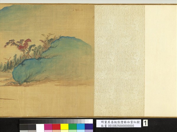 董其昌(西元一五五五-一六三六年),字玄宰,號思白,華亭(江蘇松江)人。萬曆十六年進士,官至禮部尚書,善書畫,山水筆墨爽朗,瀟灑自具風格。   此幅青綠設色。紅樹青山,白雲靄靄,一片秋光,明媚清麗。畫中點葉用赭色、胭脂、硃砂、汁綠和赭墨交相點畫,筆觸輕盈爽朗,施色鮮麗而不傷雅秀。幅末自題云:「張僧繇沒骨山,余每每倣之,然獨以此卷為愜意,蓋緣神怡務閒時所作耳。」其自許如此。