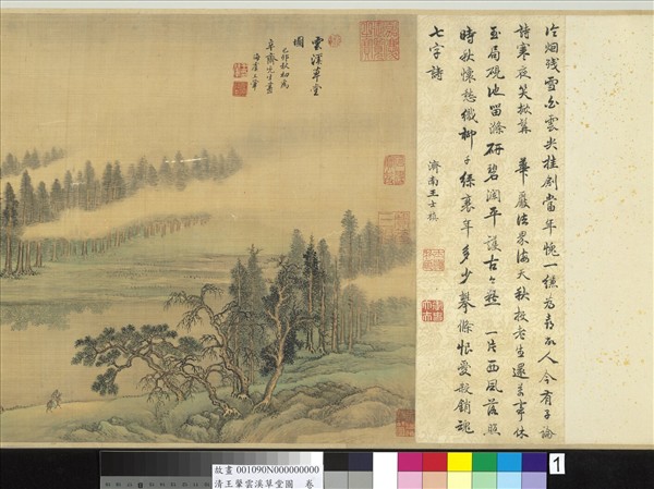 王翬(西元一六三二至一七一七年),常熟人,字石谷,號耕煙散人、清暉主人、烏目山人、劍門樵客。山水得王時敏指授,為清四大家之一。 雲溪草堂圖,王翬六十八歲為徐永宣作。雲溪草堂者,蓋徐氏之別業也。徐氏以進士授部曹,或雄於資,故有為朱竹垞刻集,見竹垞詩註中。本幅用筆甚工,以青綠設色,石谷著意作也,惟用力既多,或不免於板滯。有王士禎宋犖諸題,並可見徐之交遊。