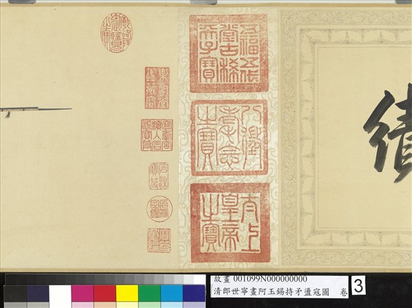 郎世寧(西元一六八八-一七六六年),意大利人。十九歲,入天主教耶穌會為修士。曾習油畫,兼習建築。二十七歲來華,以繪事供奉內廷,歷仕康熙、雍正、乾隆三朝。善畫人物、花鳥,尤善犬馬。阿玉錫,新疆準噶爾人,有罪應剉臂,後轉向清廷投效。高宗聞其勇敢善戰而召見,賜銀,擢侍衛。乾隆二十(一七五五年)平定伊犁時,於格登鄂拉立戰績。高宗為之作歌,七月命阿玉錫入覲,召郎世寧為之作持矛盪寇圖。