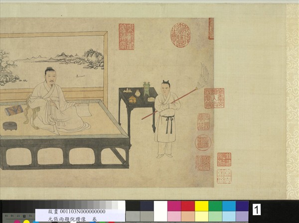 書齋之中,文士坐於榻上,後有山水屏風一座,兩側有男女侍者各一人。畫中主人身著道服,右腳屈放、左腳支起,右手執筆靠在支座上,左手持紙,如執筆寫字模樣。此為佛教人物維摩詰居士常見姿勢,宋代士人借以塑造個人形象。畫中屏風與倪瓚山水樣式相近,據張雨題贊,知此為倪瓚像。張雨題贊從外在形象直透其內在神氣,與畫像恰可參照。張雨、倪瓚與黃公望同為道友,張雨亦曾題黃公望小像。(20110609)