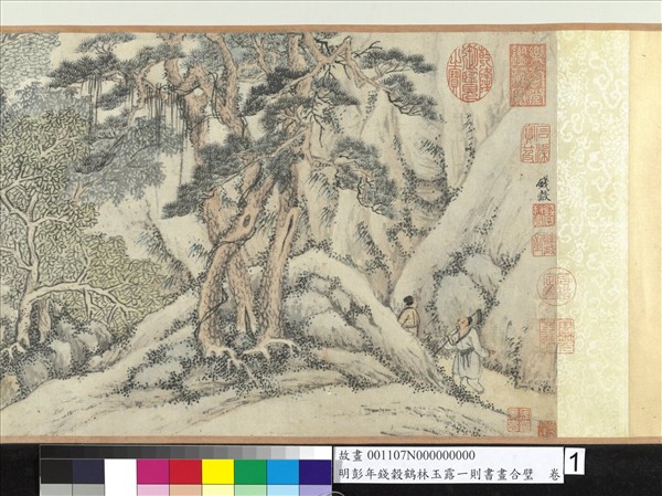 彭年(西元一五○五─一五六六年),長洲(今江蘇蘇州)人。字孔嘉,書法晉人,著有﹝龍池山樵集﹞。錢穀(西元一五○八─一五七二年),長洲人。字叔寶,文徵明弟子,山水爽朗可愛。 ﹝鶴林玉露﹞,書名,宋羅大經所著。此則繪其中一段小文,為羅氏自敘山居生活者。畫筆疏朗而蒼勁,為錢彭之合作,書亦雅秀。據彭題紀年,則此幅成時,彭年六十一歲,錢穀五十八歲。彭年於書成之次年即物故矣。