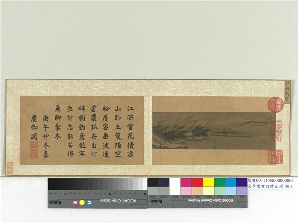 李唐(活動於十一世紀末至十二世紀初),河陽(今河南孟縣)三城人。字晞古。徽宗朝曾補入畫院,建炎(西元一一二七至一一三O年)間太尉邵淵薦之,授成忠郎、畫院待詔,賜金帶。時年近八十。善畫山水人物。筆意不凡。其山水初學李思訓後加變化,愈覺清新,為南宋四大家之首。本幅圖繪遠山積雪、雪棧茅舍,一孤舟悠行於江深水寒中。通幅以淡墨暈染,江天一色。屋後不凋的林葉,用筆精整,敷色雅淡,雖為冬林寒色景,卻在蒼茫中煥發生機,一派清新可愛。