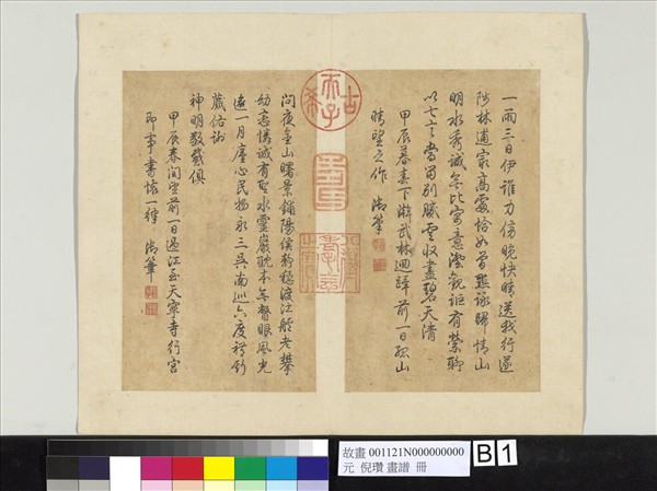 倪瓚(西元一三○一—一三七四年),字元鎮,號雲林、迂翁。家境富饒,築清閟閣,蓄古書畫、器物。善繪山水,為元四大家之一。 倪瓚之甥華子文求畫法於雲林,雲林為此作冊,時年五十歲。本冊共十幀,每頁依次繪竹林山石,並細敘畫法。畫法中語雖不求深致,而多發人所未發,甚為可貴。