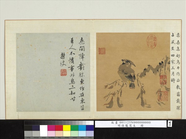 孫龍(十五世紀前半),一作孫隆,字廷振,號都痴。江蘇武進人。宣德間入值內廷,兼擅翎毛、花卉、山水。其山水宗二米,花鳥草蟲則多以彩墨渲染,能融合徐熙落墨花與趙昌沒骨法而有所發展,對後世潑彩寫意畫深具影響。 本冊繪禽蟲、花果、煙雲等,共十二開。因畫絹塗有膠礬,故筆雖濕而色不暈散,極得墨瀋淋漓的鮮活趣味。裱綾及對幅題記,分別為清仁宗、姚公綬所書。 本幅為寫生冊第一開,畫朱連雀棲息桑枝。因畫絹塗有膠礬,故筆雖濕而色不暈散,頗得墨瀋淋漓的趣味。右方裱綾,有清仁宗楷書御題:「柔桑集好鳥,力作正敷菑,戴勝占風至。田家三月時。」。對幅另有姚公綬題跋:「桑間降戴勝,東作在東菑;吾人不惰事,此鳥亦知時。逸史。」