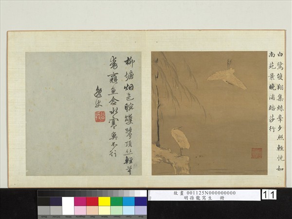 本幅為孫龍寫生冊第十一開,淺設色畫柳塘白鷺。鈐印:「孫龍圖書」。 左方裱綾清仁宗楷書御題:「白鷺雙翔集,絲牽夕照輕;恍如南苑景,晚浦踏莎行。」對幅姚公綬題跋:「柳塘烟色暝,雙鷺頂絲輕;莫動窺魚念,水寒魚不行。逸史。」